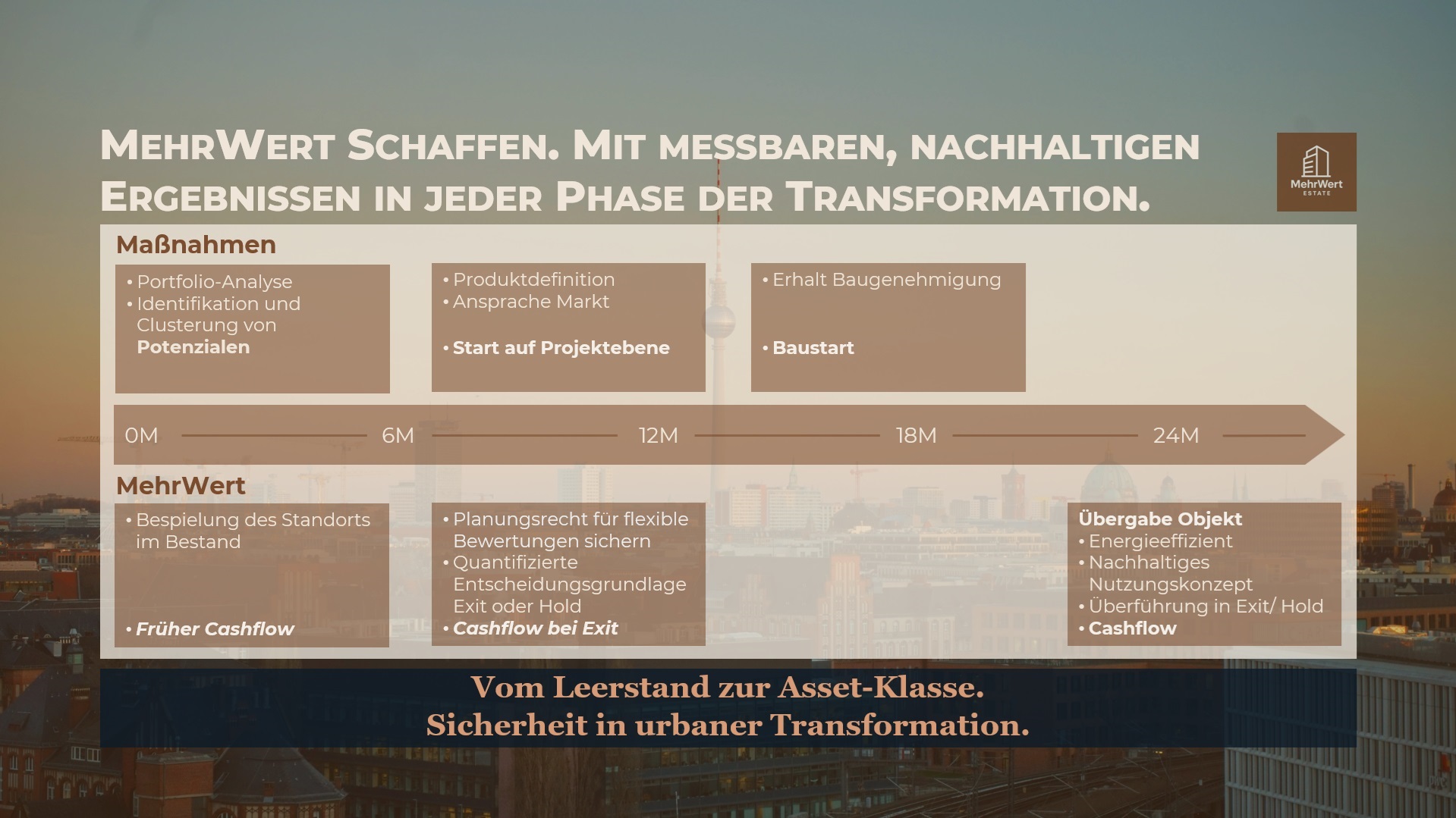 Am Ende steht ein schlüsselfertiges, resilient aufgestelltes und energieeffizientes Wohn- oder Mixed-Use-Produkt, das langfristige Cashflows sichert und nachhaltig betrieben werden kann.